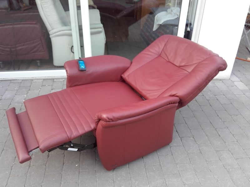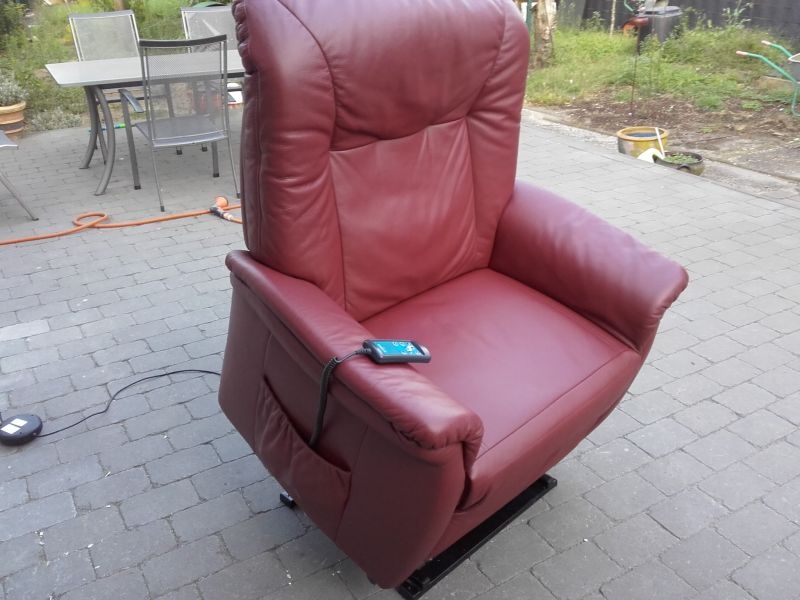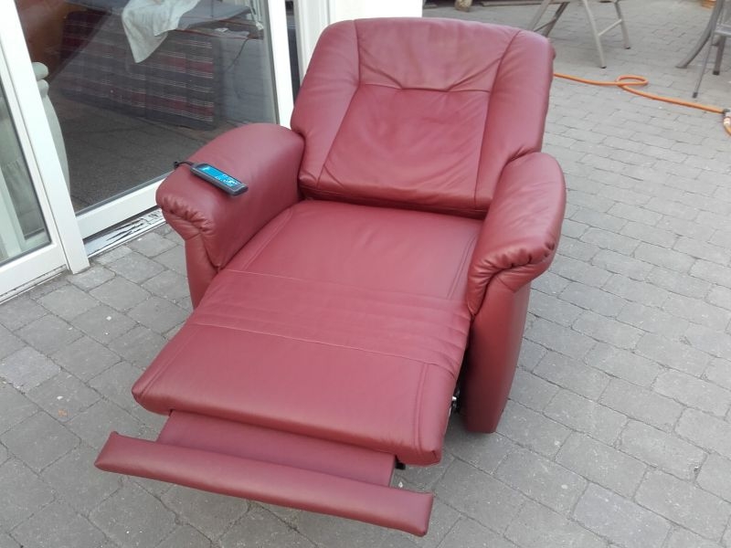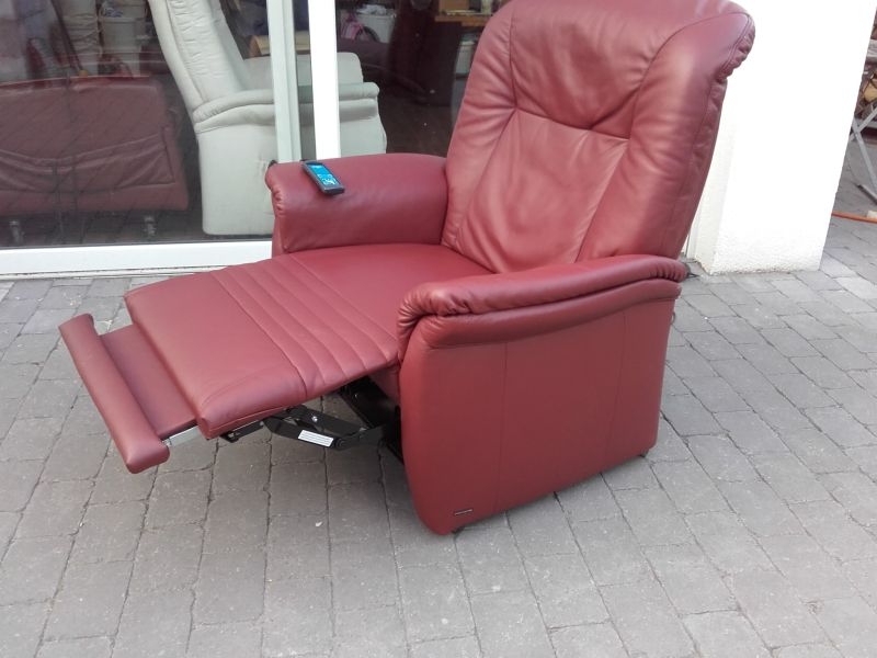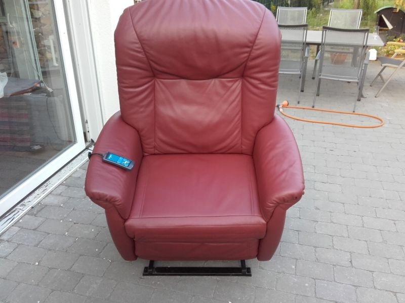 Neuwertiger XXL Fernsehsessel aus dem Hause Himolla, Modell 7706 27T40 XXL bis 200Kg belastbar, 2 Jahre alt. Sehr guter Zustand, technisch einwandfrei, wenig genutzt. Bezug: Leder rot Farbton "OXBLOOD". Fernsehsessel mit Aufstehhilfe und Liegeposition. Einfache Bedienung über beleuchtete Fernbedienung. XXL Sessel bis 200kg belastbar, 60cm Sitzbreite. Sessel hat 3 Motoren, Rückenlehne und Beinablage jeweils einzeln anzusteuern und Aufstehhilfe. Kopfstütze manuell verstellbar, Fußstützenverlängerung. Neupreis ca. 4500.-€. Sessel steht auf Rollen und kann auch mal durchs Zimmer geschoben werden, bei der Aufstehhilfe stellt sich der Sessel auf einen Rahmen und kann dann nicht mehr verrutschen.