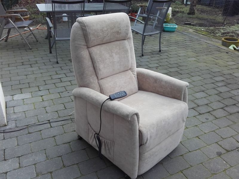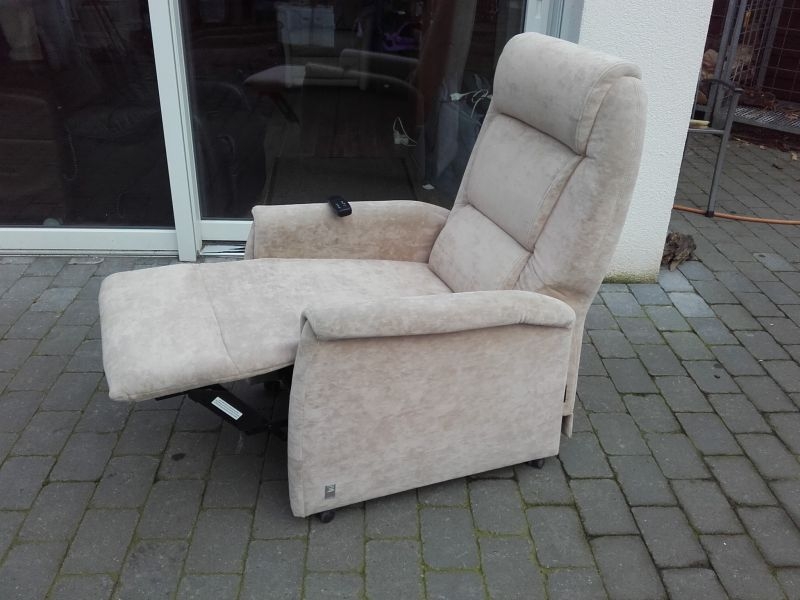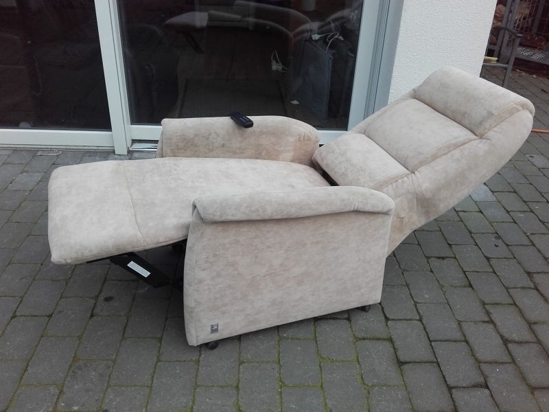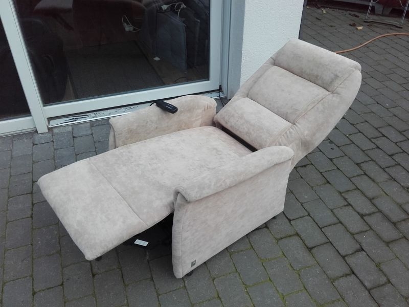 Gepflegter Fernsehsessel aus dem Hause Himolla, Modell 9773 28Y40 2 motorig mit Aufstehhilfe, selten genutzt, technisch einwandfrei. Bezug Velours in der Farbe "BEACH". Fernsehsessel mit Aufstehhilfe, einfache Bedienung über Fernbedienung. Sessel für Personen von 160cm bis 180cm Körpergröße, belastbar bis 110Kg Körpergewicht. Sehr komfortabel. Sessel steht auf Rollen und kann auch mal durchs Zimmer geschoben werden, bei der Aufstehhilfe stellt sich der Sessel auf einen Rahmen und kann dann nicht mehr verrutschen. Rückenteil und Fußteil einzel zu steuern und Aufstehhilfe.